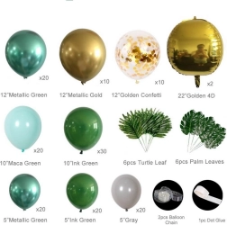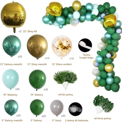 Alkoss otthon vagy az ünnepségen látványos dekorációt ezzel a nagy, zöld és arany tónusú lufifüzérrel. A szett vegyes méreteket, konfettis lufikat és trópusi leveleket tartalmaz a friss, dzsungel hangulathoz. A lufik levegővel vagy héliummal fújhatók fel, és lyukas rögzítős szalag segítségével könnyen gazdag, íves dekorációvá kapcsolhatók.