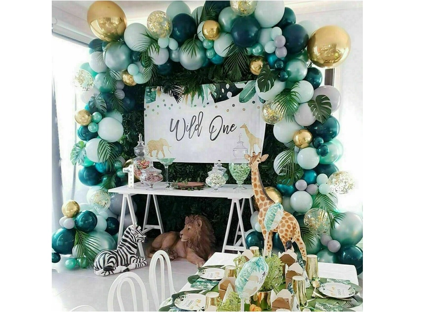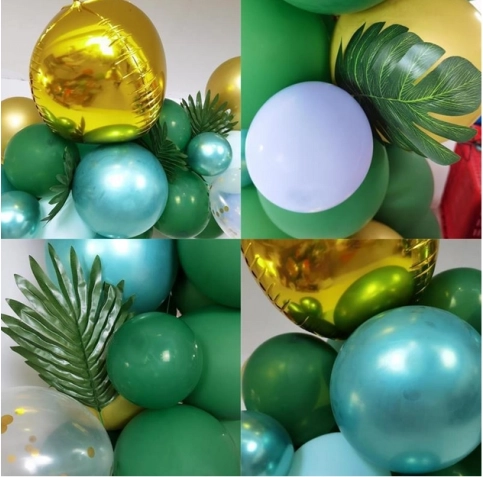 Az összeállítás egyszerű: fújd fel a lufikat levegővel vagy héliummal, majd rögzítsd a lyukas rögzítős szalagra. A kisebb lufikat oszd el a perem mentén a telt, rétegzett hatás érdekében. A trópusi és pálmalevelek egzotikus karaktert adnak az összhatásnak, és tökéletesen illenek a zöld–arany palettához.
