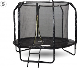 A polipropilén JUMPING MAT ugrófelületet 8 erősítő varrás teszi ellenállóbbá a terheléssel szemben. A profilozott fém oszlopokat puha védőhab borítja, a bejárat pedig kettős biztosítással (cipzár + csat) rendelkezik. A kényelmes feljutást kétszintes létra segíti.