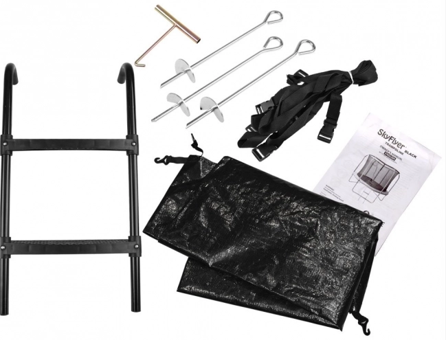 Létra, földhorgok hevederekkel, esőálló védőtakaró és rugófeszítő szerszám – minden az egyszerű szereléshez és a biztonságos használathoz.