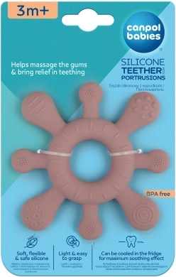 A kiemelkedésekkel ellátott Canpol babies szilikon rágócska a gyermek kényelmét és fejlődését szem előtt tartva készült. A rágó változatos felülete gyengéden masszírozza az ínyt és enyhíti a fogzás okozta fájdalmat. A rágócska formája ideális a kis babakezekhez, megkönnyíti a megfogást. Puha, rugalmas és biztonságos szilikonból készült, amely kíméletes a baba érzékeny ínyéhez. A kiemelkedésekkel ellátott Canpol babies CSILLAG szilikon rágócska nem tartalmaz káros BPA-t (biszfenol A), így teljesen biztonságos a gyermek egészségére nézve. A csillag szélein eltérő textúrákkal rendelkező Canpol babies szilikon rágócska támogatja a gyermek finommotorikájának fejlődését.Megkönnyebbülést hoz a fogzás időszakában!Könnyű és praktikus – ideális a kis babakezekhez.Puha és biztonságos szilikon – kíméletes a gyermek érzékeny ínyéhez.Támogatja a finommotorika és a kéz–szem koordináció fejlődését.A termék 3 hónapos kortól ajánlott.A játék biszfenol A-mentes, biztonságos anyagból készült.Használati útmutató:Tartsa a játékot tisztán. Lágy kefével, folyó víz alatt, enyhe tisztítószerrel mossa el, majd alaposan öblítse le.Fontos! Gyermeke biztonsága és egészsége érdekében!Első használat előtt forró vízzel öntse le. Ne forralja, ne sterilizálja. Ne hagyja közvetlen napfényen, mert kifakulhat vagy megrepedhet. Minden használat előtt gondosan ellenőrizze. Cserélje le, ha a termék elhasználódott, sérült vagy megrágott. Őrizze meg a használati útmutatót későbbi felhasználásra! Nem alkalmas mosogatógépben való mosásra, kifőzésre és sterilizálóban történő sterilizálásra.A rugalmas rágó megfelel az alábbi követelményeknek:Az Európai Parlament és a Tanács 2009/48/EK irányelve a játékok biztonságáról,EN 71 - 1 Játékok biztonsága – 1. rész: Mechanikai és fizikai tulajdonságok,EN 71 - 2 Játékok biztonsága – 2. rész: Gyúlékonyság,EN 71 - 3 Játékok biztonsága – 3. rész: Egyes elemek migrációja.