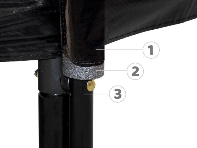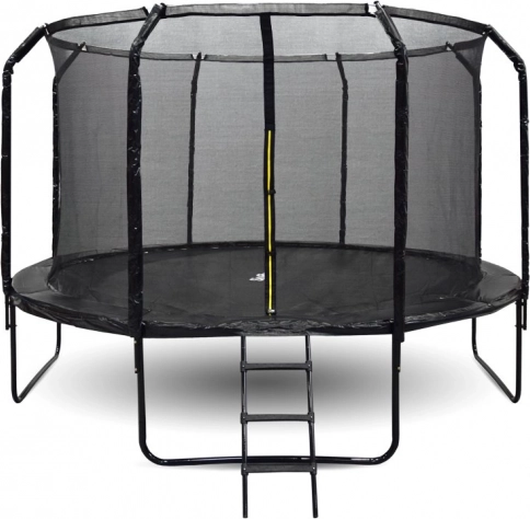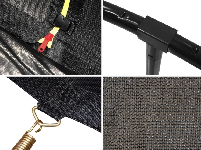 A gyűrűvel megfeszített magas védőháló tartja a formát, a bejárat cipzárral és csattal biztosított. A profilozott fémoszlopok puha párnázást kaptak a biztonságos ugrálásért.