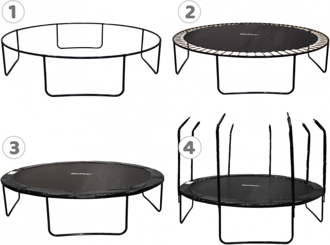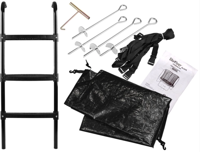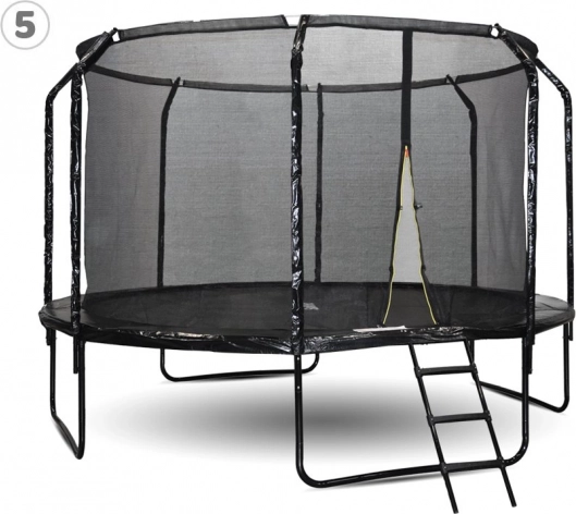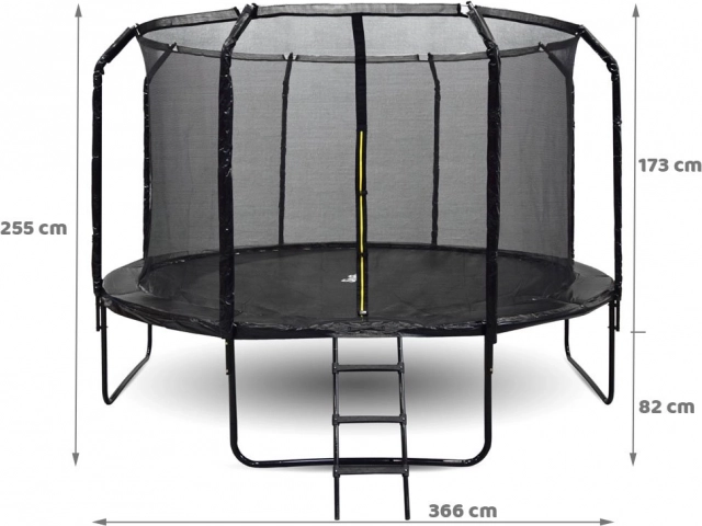 A masszív váz erős, oxidált rugókkal és U-lábakkal stabilan tartja a trambulint, míg a védő perem biztonságosan fedi a rugókat. A praktikus háromfokú létra a gyerekek számára is megkönnyíti a feljutást. A csomagban horgonyok hevederekkel, vízálló takaró és szerelési eszközök is találhatók – minden az egyszerű telepítéshez és a problémamentes használathoz.