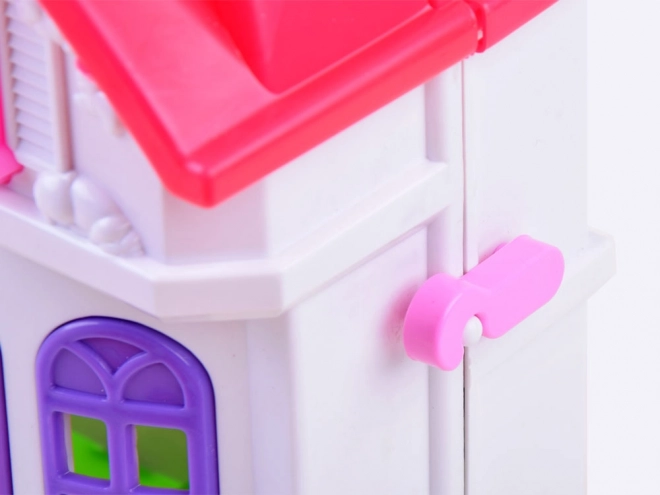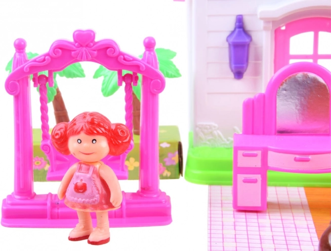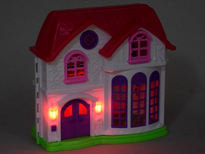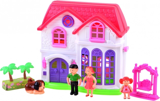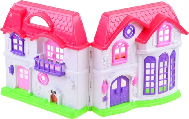 Az összecsukható babaház élénk színeivel és részletgazdag kidolgozásával nyűgöz le – a homlokzatot virágok és madarak domborulatai díszítik. Kinyitva áttekinthető játéktér jön létre, ahová a gyerekek könnyedén elrendezhetik a bútorokat. Az anya, apa és lányka figuráinak karjai mozgathatók és a fejük forgatható, így rengeteg szerepjátékra adnak lehetőséget. A praktikus fényhatású csengő jelzi a vendégek érkezését, és a játéknak az igazi otthon varázsát kölcsönzi.