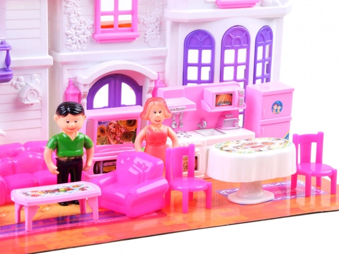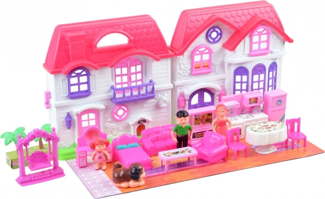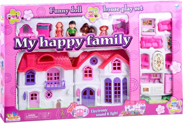 Az elegáns, tartós műanyagból készült, összecsukható családi babaház órákon át tartó, ötletes szórakozást nyújt a gyerekeknek. Tartalmaz gazdag kiegészítőket, a család és a kutyus figuráit, fényhatású csengőt és színes matricákat minden helyiség egyedi kialakításához.