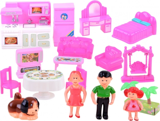 Rendezze be a hálószobát, a nappalit és a konyhát – a csomagban talál ágyat, kanapét, karosszéket, asztalt és székeket, tévét szekrénnyel, konyhabútort és hűtőszekrényt, valamint a család és a kutyus figuráit.