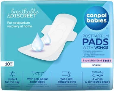A Canpol babies szuperabszorbens szülés utáni betétek szárnyakkal tökéletes megoldást jelentenek a gyermekágyas időszakban, otthoni használatra a kórház elhagyása után. A szárnyas szülés utáni betétek vékonyabbak és diszkrétebbek, mint a hagyományos szülés utáni betétek, ugyanakkor rendkívül nedvszívóak és légáteresztők. A hagyományos betétek ebben a helyzetben nem működnek megfelelően. A 42 cm-re hosszabbított szülés utáni betét szárnyakkal úgy lett kialakítva, hogy fekvő helyzetben is jól védjen a szivárgás ellen. A Canpol babies szárnyas szülés utáni betétei mindössze 2,2 mm vastagok, mégis akár 100%-os védelmet és diszkréciót nyújtanak a szivárgással szemben. Az ultraabszorbens mag gyorsan felszívja a folyadékot és a nedvességet belül tartja, ezáltal hosszan tartó száraz és kényelmes érzetet biztosít. A formázott alak, a 4 szárny és a széles öntapadó csík mozgás és aktivitás közben is a helyén tartja a betétet, valamint éjszaka, amikor alvás közben fordulsz. A puha felső réteg szorosan illeszkedik a betét töltetéhez, nem laminálódik le, megakadályozza a bőrhöz tapadást és az irritációt. Bőrbarát és teljesen légáteresztő, míg a szagsemlegesítő technológia friss érzetet ad az édesanyának. A csomag 10 darabot tartalmaz. Szülés utáni szárnyas betétek nappalra. A betét mérete: hossz 34 cm, vastagság 2,2 mm. Szülésznő ajánlásával. • Fokozott kényelem a gyermekágyas időszakban – nappal. • Ultra nedvszívó mag – gyorsan felszívja a folyadékot és a nedvességet a betét belsejében tartja, hosszan tartó száraz érzetet biztosítva. • Különösen puha és légáteresztő – védi a bőrt az irritációtól. • 4 szárny és formázott alak a hatékony védelemért és nagyobb kényelemért. • Széles ragasztócsík a betét helyben tartásához. • Szagsemlegesítő technológiával. • Betét mérete – hossz 34 cm. Használati útmutató: Ne feledd, hogy a szülés utáni betéteket rendszeresen cserélni kell. Használat után a betétek könnyen ártalmatlaníthatók. Őrizd meg az útmutatót későbbi használatra. Figyelmeztetés! A termék nem játék. Tartsd gyermekek elől elzárva. A betétek megfelelnek az Európai Parlament és a Tanács 2001/95/EK irányelvének az általános termékbiztonságról.