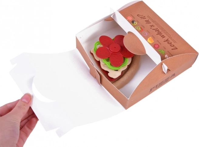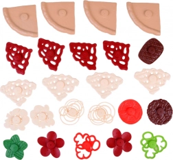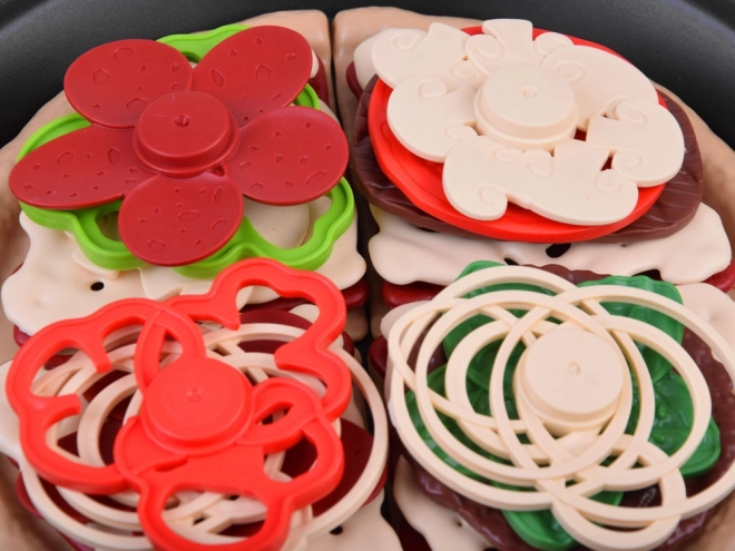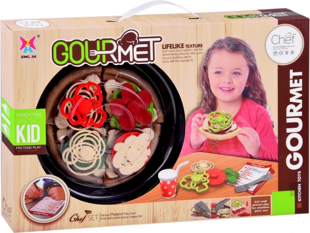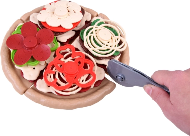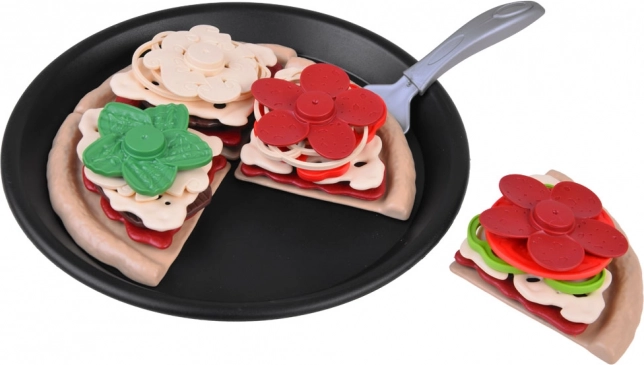 A pizza szeletekre van osztva, és műanyag pizzavágó kerékkel könnyedén „vágható”. A gyerekek gyakorolják a finommotorikát, és valósághű ételkészítési élményben lesz részük.