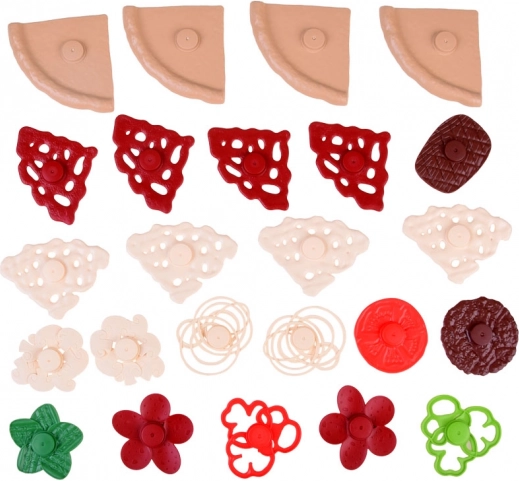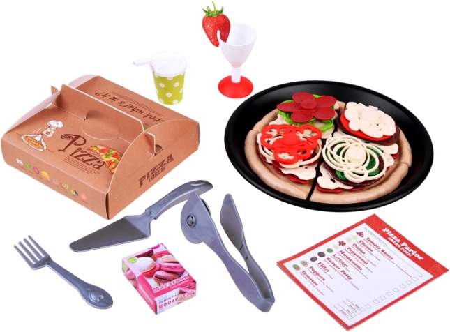 A készlet tartalmaz tésztadarabokat, szószt, sajtszeleteket és sok színes feltétet, mint pepperoni, gomba, paprika, paradicsom és saláta. Nem hiányzik a pizzavágó kerék, a pizzalapát, az evőeszközök, a tányér, üdítős poharak, menü és a pizzás doboz sem.