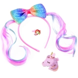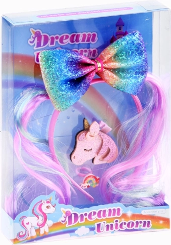 Stílusos és színes hajdísz szett, amely pillanatok alatt mesés megjelenést varázsol. A puha szaténbevonatú fejpánt kényelmes viselet, és egy feltűnő, csillogó, szivárvány színű masni díszíti pónimintával. A szettet kiegészíti a fényes unikornisos csat és a bájos műanyag szivárványos gyűrű, amelyek játékos hangulatot adnak az öltözéknek.