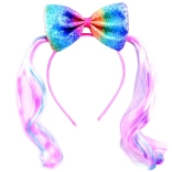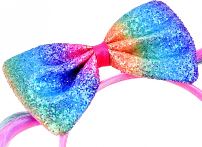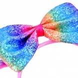 A feltűnő, szivárványos masni azonnal magára vonja a tekintetet, és egyedi, ünnepi megjelenést kölcsönöz a frizurának.