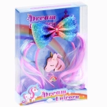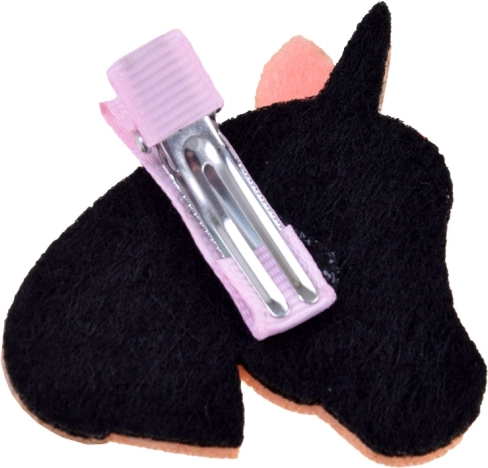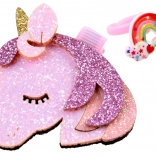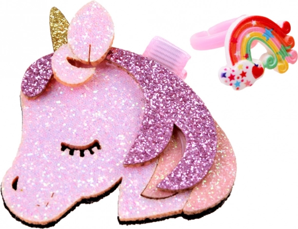 A fényes, unikornisfej formájú csat helyén tartja a hajtincseket, és játékos, mesés hangsúlyt ad.