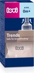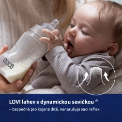A LOVI Trends üveg szakértők közreműködésével készült és klinikailag tesztelt. A speciális dinamikus cumi vékony szilikonrétegből természetesen megnyúlik és összehúzódik a baba tempójához igazodva etetés közben, míg a merev, széles, profilozott alap stabil támaszt ad az ajkaknak és gátolja a rágcsálást. A SUPER-vent antikólikás rendszer korlátozza a levegő bejutását a tejbe, ezzel segít megelőzni a kólikát.