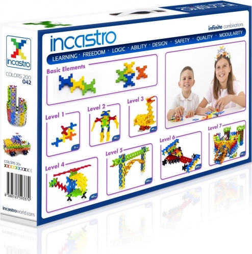 Az INCASTRO egy okos, Olaszországban gyártott építőkészlet, amely az elemek kifinomult formájának köszönhetően szinte korlátlan lehetőségeket kínál. Néhány darabból könnyedén összeállíthat sík mintákat, tornyokat, járműveket, állatokat és működő modelleket is. Az elemek pontosan illeszkednek egymásba, a szerkezetek pedig szilárdan egyben maradnak.