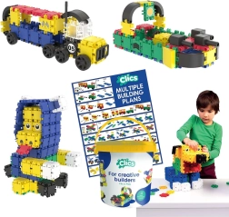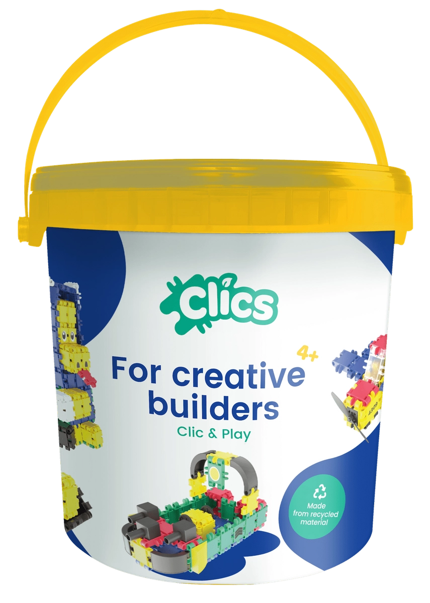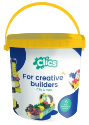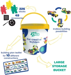 A CLICS építőkészlet vödörben 275 színes elemet és inspirációt kínál 10 különböző modellhez. Az elemek biztosan „kattannak” egymásba, az építés gyors és intuitív, így a gyerekek azonnal az ötlettől a kész 2D vagy 3D konstrukcióig juthatnak. Alkalmas önálló játékhoz és közös alkotáshoz is.