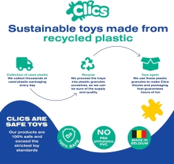 A CLICS Belgiumban készül tanúsított anyagokból, és számos nemzetközi díjat nyert. Tartós kialakításának köszönhetően a modellek funkcionálisak és készen állnak a játékra – az autók gurulnak, a légcsavarok forognak, a figurák mozognak. A vödör típusú csomagolás praktikus a tároláshoz és a hordozáshoz.