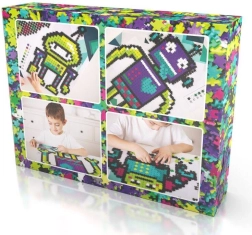 Hatalmas mennyiségű apró, „pixeles” elem élénk színekben támogatja a fantáziát: a három ajánlott robotmotívtól a saját mozaikokig és egyszerű 3D építményekig.
