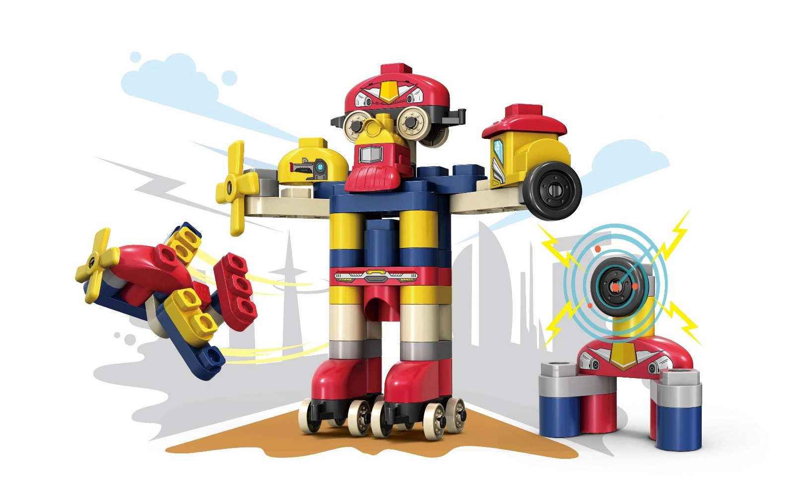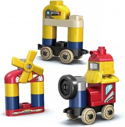 DUPLO stílusú kockák, amelyekből robotot, repülőt építhet. A kockákra ragasztott képeknek köszönhetően a gyermek tanulhat is játék közben.