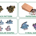 A csomag tartalmaz külön álló mintát, amely megkönnyíti a kirakást, és minden környezetbarát papírdobozban van tárolva. A puzzle 3-4 mm vastag kemény merevlemezből készült.
