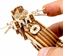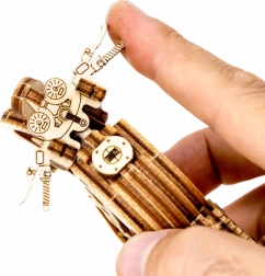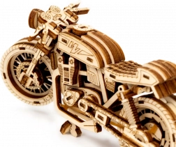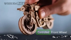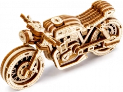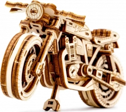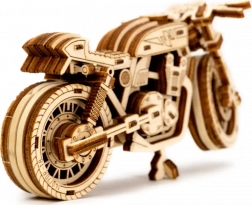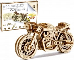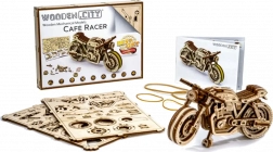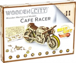 A WOODEN CITY Café Racer motorbicikli részletgazdag fa modell 1:16 méretarányban, amely életre kelti az íróasztalt vagy a vitrint. A gumimotor és a visszahúzós mechanizmus révén a modell előre és hátra is mozog, kb. 1 méteres távot képes megtenni, és betekintést nyújt a valódi fogaskerék-mechanikába.