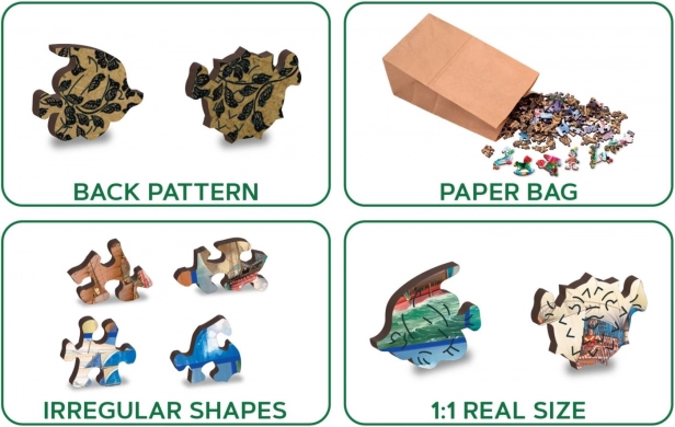 Környezetbarát jellegének köszönhetően a puzzle papírzacskóban van csomagolva, papírdoboz belsejében, így ideális ajándék bármilyen alkalomra.
