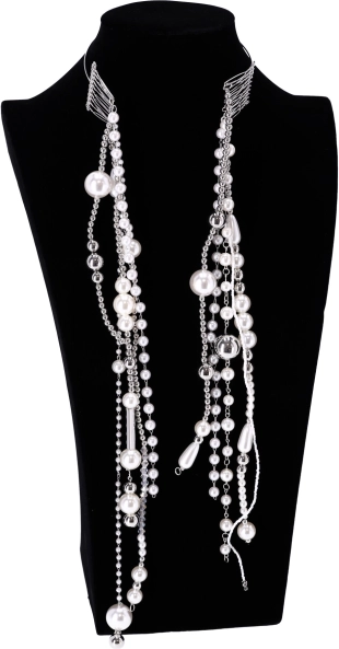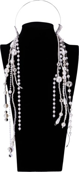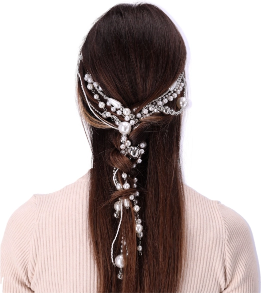 A hajpánt kifinomult megjelenést biztosít a mesterséges gyöngyök és a láncok révén.