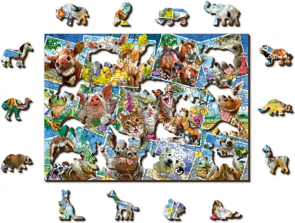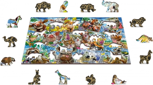 A WOODEN CITY fa puzzle „Állatos képeslap” motívummal egyedülálló kirakóélményt nyújt. A kétoldalas kivitelnek köszönhetően választhat a színes kép szerinti kirakás és a hátoldali ismétlődő minták formái szerinti kirakás között. A lézerrel kiemelt részletek látványossá teszik az egyes darabokat, és néhányuk – állatok, épületek vagy tárgyak formájában – önállóan is megáll, mint kis figurák.