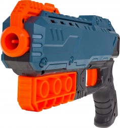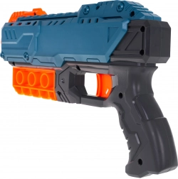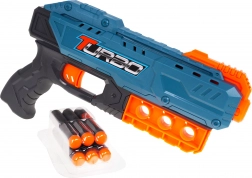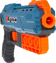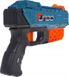 Szórakoztató és biztonságos Turbo gyerek pisztoly kék színben 8 éves kortól, kézi felhúzással, elemek nélkül, puha hablövedékekkel gumicsúccsal és hosszú hatótávval. A csomagban 6 lövedék található, a blaster testén pedig tartók a gyors tartalékhoz.