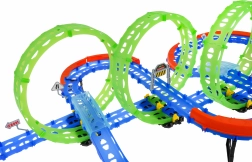 Építsd meg saját versenykörödet három nagy hurokkal, és élvezd az izgalmas futamokat a LED-es autóval. A fluoreszkáló elemeknek köszönhetően a pálya sötétben is világít, így este is látványosak a versenyek. A stabil szerkezet, a védőkorlátok és a változatos szakaszok egyenletes haladást és nagy sebességet tesznek lehetővé.