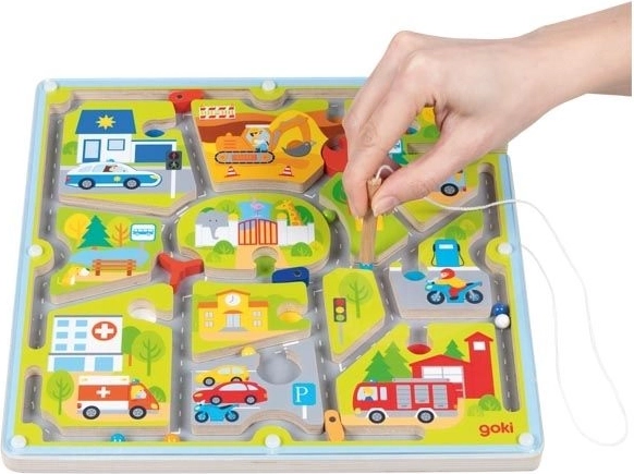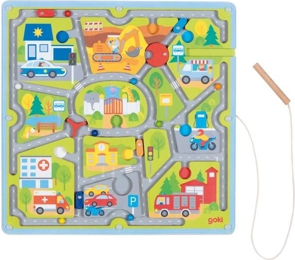 Fedezze fel a mágneses városi útvesztő játékot a GOKI-tól, ahol a gyerekek mágneses tollal vezetik az autókat kereszteződésekkel és tiltásokkal teli utcákon. A játék fejleszti a finommotorikát, a koncentrációt és az alapvető közlekedési ismereteket a tiszta vizuális ingereknek és a biztonságos, fából készült kivitelezésnek köszönhetően.