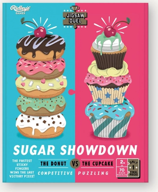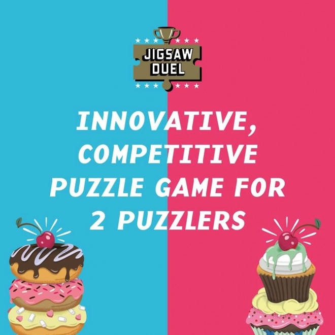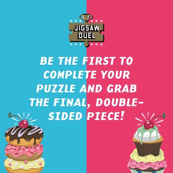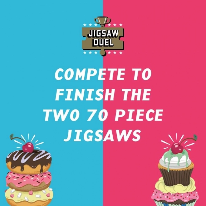 Élvezd a kétszemélyes kirakós kihívást a Puzzle Párbaj Édes leszámolás: fánk vs cupcake játékkal. Két mini puzzle, egyenként 70 darabbal, verseny az utolsó közös darabért és színes mintaképek a csomagban garantálják a remek szórakozást pároknak, barátoknak és családoknak.