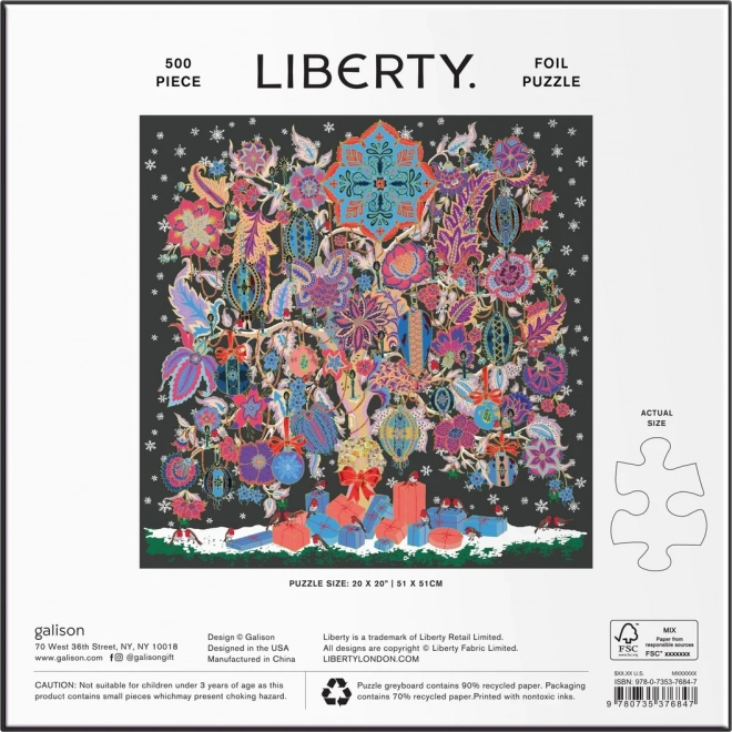 Élvezze a pihenést az elegáns, négyszögletes puzzle összeállításával, amelynek motívuma a Liberty: Karácsonyi életfa. A motívum egyes részeinek speciális, fémesen csillogó felülete arany- és ezüsthatást kölcsönöz, amelynek köszönhetően a kép különböző szögekből ragyog. A csomagban mintakép is található a kényelmesebb kirakáshoz.