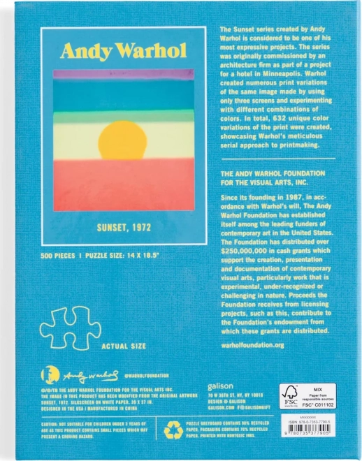 Fedezze fel az eredeti, 500 darabos puzzle-t ANDY WARHOL: Naplemente motívummal, amely egyesíti a művészetet és a szórakozást egy kivételes élményben. Kompakt, készre rakott méreteinek és elegáns csomagolásának köszönhetően remek ajándék és stílusos darab a könyvespolcon.