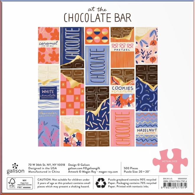 Stílusos kirakó színes csomagolású csokoládék motívumával, Megan Roy tervezésében. A 500 precízen vágott darabnak köszönhetően tökéletes egy nyugodt estére vagy hétvégi kirakásra. A kb. 51 × 51 cm méretű négyszögletes formátum szépen mutat az asztalon, és keretezve a falon is.