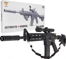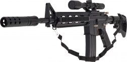 A nagy katonai M4 gélgolyós puska 14 éves kortól ajánlott. Kifejezetten hidrogél golyókkal használható, amelyek a célpont eltalálásakor szétpattannak. Ebben a modellben 7–8 mm átmérőjű golyók használata javasolt. A készlet része egy zacskó előkészítetlen golyó. A golyók előkészítéséhez öntse fel őket vízzel, hagyja állni kb. 4–6 órát, majd öntse le a felesleges vizet – így készen állnak a lövedékek. A puskán kézi és automata lövési mód is található. A fegyver irányzéka nagyítóval rendelkezik, a tárcsa segítségével beállíthatjuk a céltávolságot. A játékot egy 3,7 V-os akkumulátor táplálja, amely a készlet tartozéka. |