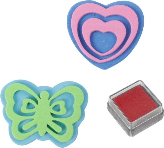 Könnyű habbélyegzők és piros tintapárna bővítik a dekorálási lehetőségeket. Papírhoz és otthoni projektekhez egyaránt remek választás a kis alkotóknak.