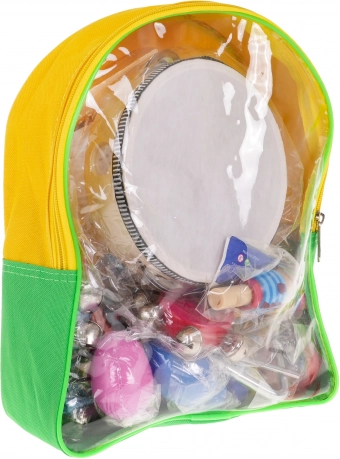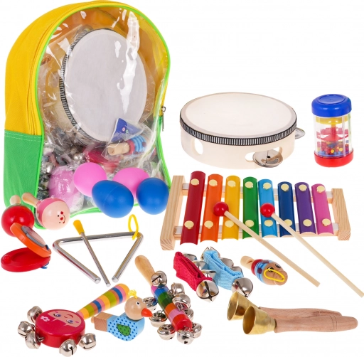 Bemutatjuk a nagy fa hangszerkészletet 2 éves kortól. Ez a színes és biztonságos szett 23 különböző elemet tartalmaz, mindet egy praktikus, könnyen hordozható hátizsákban.