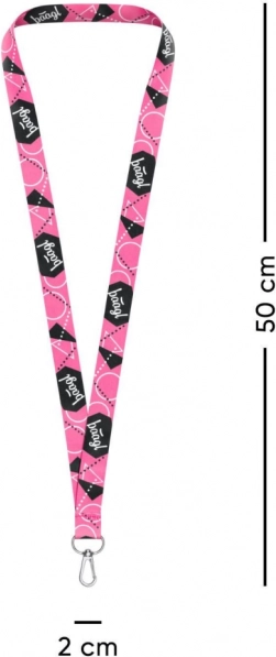 A pánt fekete részein feltűnő BAAGL logó és szívecskés minta emeli ki az egyedi megjelenést. A nyakpánt ideális kulcsok, ID-kártyák, pendrive-ok vagy apró kiegészítők számára, és 45 cm-es hossza révén kényelmesen viselhető a nyakban vagy táskára csíptethető.