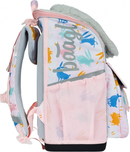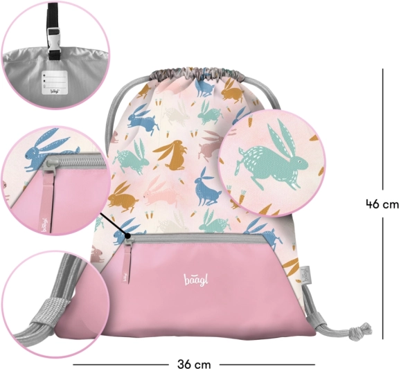 A BAAGL Zippy Bunny szett játékos dizájnt párosít az egészséges hordhatósággal és a rendezettséggel. Az ERGO ADJUSTABLE SYSTEM csúsztatható rendszerű iskolatáska a gyermek növekedéséhez igazítható, megerősített, ergonomikusan formázott hátfallal, teljesen állítható pántokkal és stabil, könnyű szerkezettel. Az új felnyitható nyitórendszer megkönnyíti a könyvek elérését közvetlenül a padból.