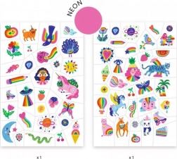 Az ideiglenes tetoválások remek kiegészítők gyerekzsúrokra, ajándéktasakokba vagy kis jutalomként. A csomag 2 ívet tartalmaz, több mint 50 motívummal szivárványos színekben.