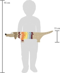 Színes, fából készült tacskó alakú kirakó 26 nagy elemmel, amely játékosan segít elsajátítani az ábécét. A masszív kivitelnek köszönhetően az elemek jól illeszkednek a kis kezekbe, és fejlesztik a finommotorikát, a logikus gondolkodást és a koncentrációt. Ideális oktatójáték óvodás és kisiskolás gyerekeknek, amely stílusos dekorációként is örömet okoz a gyerekszobában.