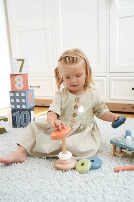 Hat különböző méretű gyűrű tanítja a gyerekeket a pontos fogásra, a sorbarendezésre és a kéz–szem koordinációra a szórakoztató felfűzés közben.