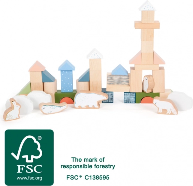 Ez a modern, sarkvidéki motívumú fa építőkocka-szett számtalan lehetőséget kínál a szabad játékra. A gyerekek házakat, tornyokat és jeges tájakat építhetnek, és történeteket találhatnak ki a sarki állatokkal. A természetes megjelenést finom pasztell színek és illusztrációk egészítik ki, amelyek felkeltik az érdeklődést és fejlesztik az esztétikai érzéket.