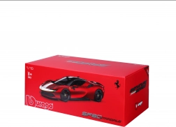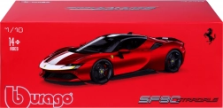 A Bburago Ferrari SF90 Stradale Assetto Fiorano 2020 modell hűen adja vissza a FERRARI első plug-in hibridjének karakterét. Az Assetto Fiorano különkiadás a maximális teljesítményre és menetdinamikára fókuszál – ezek az elemek a modell pontos kivitelezésében is megjelennek. A piros fényezés kontrasztos részletekkel kiemeli a sportos dizájnt és az aerodinamikus vonalakat.