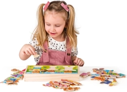 A nagy fa elemeket a gyerekek könnyen megfogják, a pontos illesztés a táblába fejleszti a kéz-szem koordinációt, a türelmet és a koncentrációt.