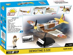 Építsd meg a hűen kidolgozott Dewoitine D.520 repülőgépet 1:32 méretarányban a COBI-tól, 335 elemből. A modell mozgó elemeket kínál (légcsavar, csűrők, nyitható kabin, behúzható futómű), 100% nyomtatás matricák nélkül, pilótafigurát és névtáblás állványt. EU-ban készült, és kompatibilis más márkákkal.