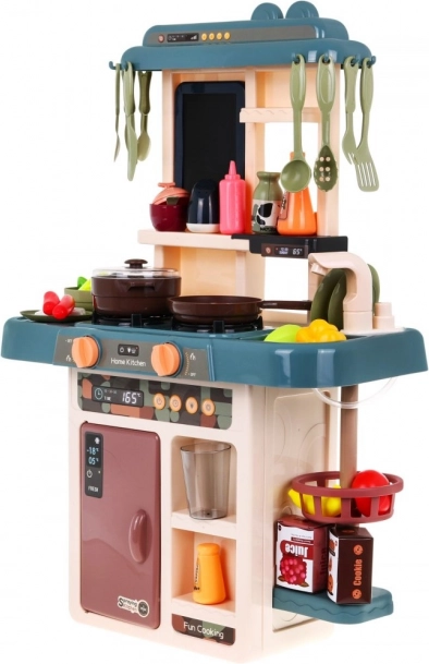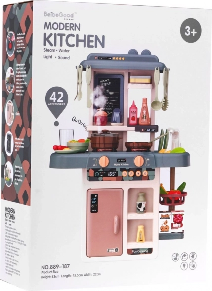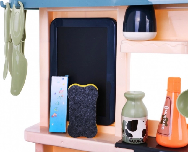 A szett gazdag felszereltséget is tartalmaz, beleértve jegyzet táblát, fazekakat fedővel, serpenyőket, tányérokat, evőeszközöket, szimulált ételeket, mint zöldségek és gyümölcsök, és még sok mást. Stabil szerkezete és pasztell színei biztosítanak nemcsak szórakozást, hanem esztétikus élményt is.