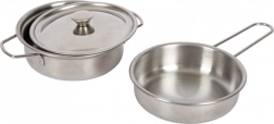 Minden benne van egy kis szakácskalandhoz: serpenyő, fedeles fazék, grillcsipesz, fa lapát, konyharuha és 2 kartonív élelmiszerrel/hozzávalókkal. Kompakt méreteinek és a kötélfogantyúnak köszönhetően ideális utazáshoz, a gyerekszobába és a kertbe is.