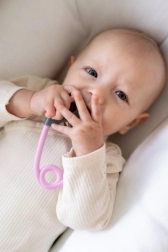 A csörgő belsejében található golyók finom hangot keltenek, ami serkenti a gyermek hallási érzékeit.