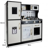 A KRUZZEL stílusos, fekete–fehér–arany színű, fa XL játékkonyhája valósághű főzőjátékot kínál a gyerekeknek. Tartalmaz erős LED háttérvilágítást, égőhang-effekteket, mozgatható elemeket és gazdag, ingyenes tartozékkészletet (lábas, serpenyő, fedő, 4 kanál). A kivehető mosogató, a sütő, a mikrohullámú sütő és a „kattanós” tárolószekrények támogatják a kreativitást, a játékos tanulást és a szerepjátékot.